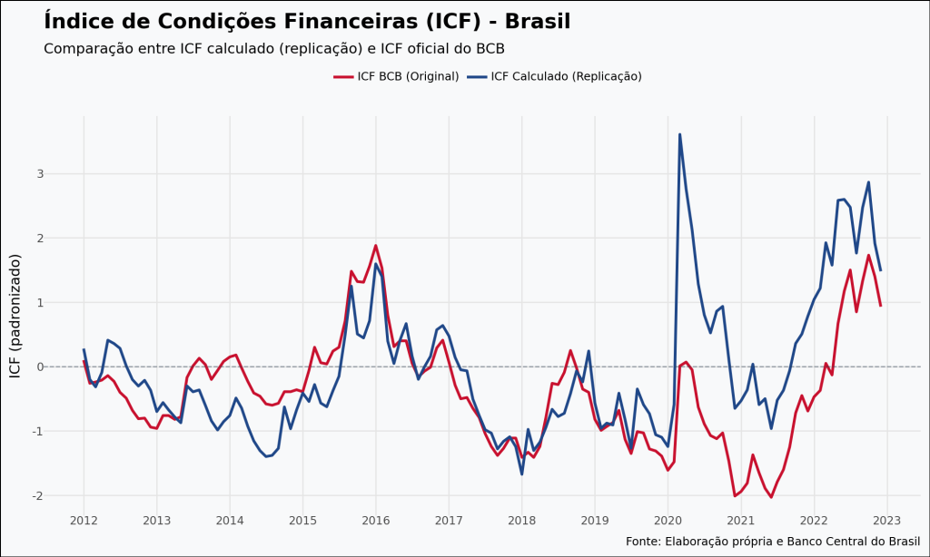 Este exercício apresenta a replicação do Índice de Condições Financeiras (ICF) do Banco Central do Brasil utilizando a linguagem Python. O estudo detalha o ciclo completo de dados: coleta automatizada de variáveis locais e globais (via APIs do BCB, FRED e Yahoo Finance), tratamento estatístico (padronização e remoção de tendência) e modelagem via Análise de Componentes Principais (PCA). Os resultados validam a metodologia, gerando um indicador aderente à dinâmica histórica de aperto e afrouxamento financeiro da economia brasileira.
