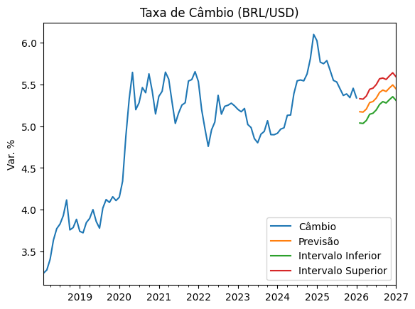 O gráfico acima apresenta o resultado do forecast. No cenário considerado, a taxa de câmbio ao final de 2026 situa-se no intervalo entre 5,35 e 5,63 reais por dólar. Esse intervalo é consistente com a dispersão das projeções observadas no Boletim Focus no momento da publicação, refletindo a incerteza embutida nas expectativas de mercado.
