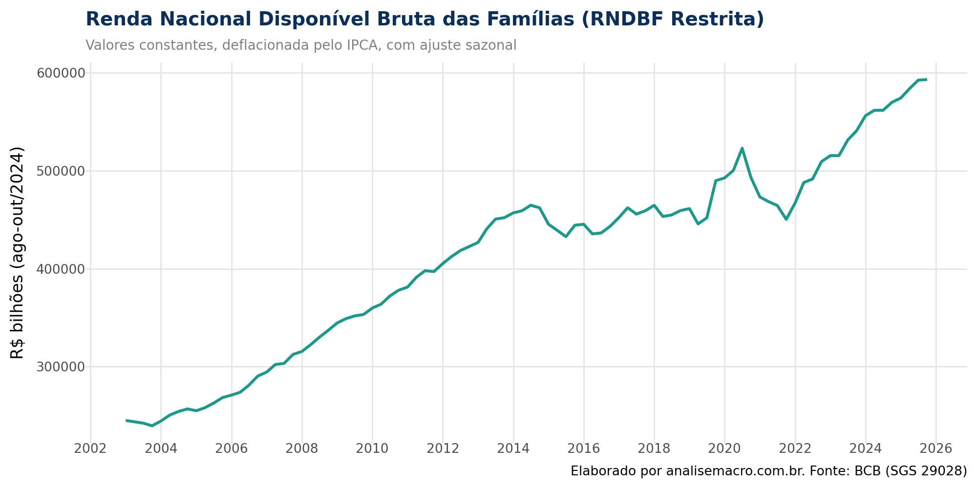 A renda disponível das famílias apresenta uma trajetória de crescimento no longo prazo, interrompida pela recessão de 2015–2016, seguida por um período de relativa estabilidade, sem tendência bem definida, até o final da pandemia. A partir de 2022, observa-se uma aceleração do crescimento, com a renda retomando uma trajetória claramente ascendente. Em termos econômicos, espera-se que aumentos na renda disponível estejam associados à expansão do consumo de bens, enquanto retrações da renda tendem a produzir o efeito oposto