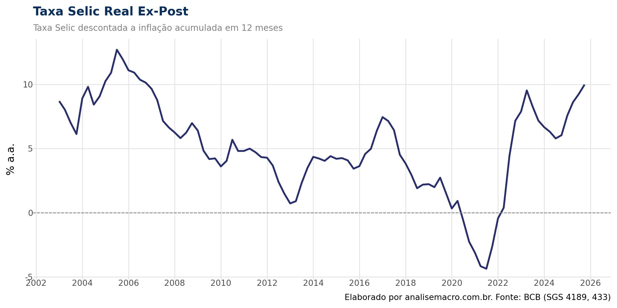 1. Taxa de Juros Real Ex-Post: Calculada a partir da taxa Selic nominal, descontada pela inflação acumulada em 12 meses (IPCA), conforme a equação de Fisher.