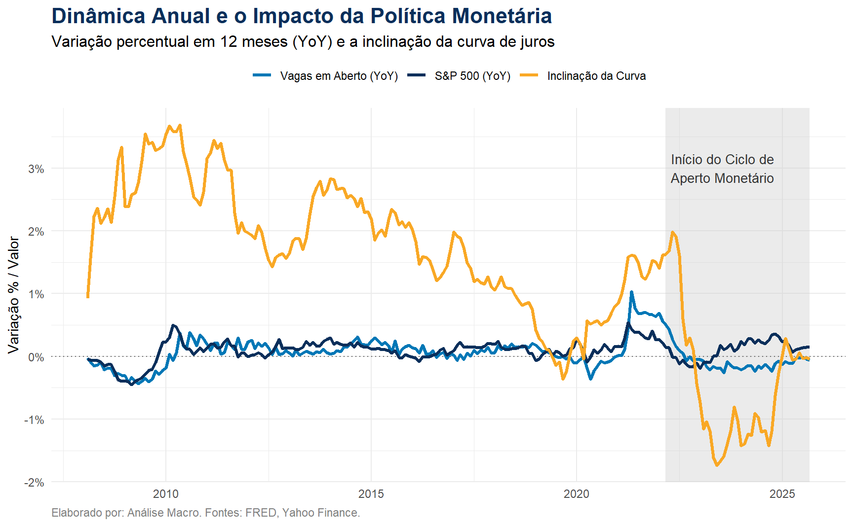 O gráfico resultante é impressionante. Até 2022, as duas séries exibem um comovimento notável. Ambas caem durante a crise de 2008, se recuperam juntas e disparam após o choque inicial da pandemia de COVID-19. A partir do início de 2022, no entanto, a relação se desfaz. O S&P 500 (em amarelo) inicia uma queda acentuada, enquanto as vagas em aberto (em azul) permanecem em níveis historicamente elevados, apenas começando a moderar muito mais tarde.