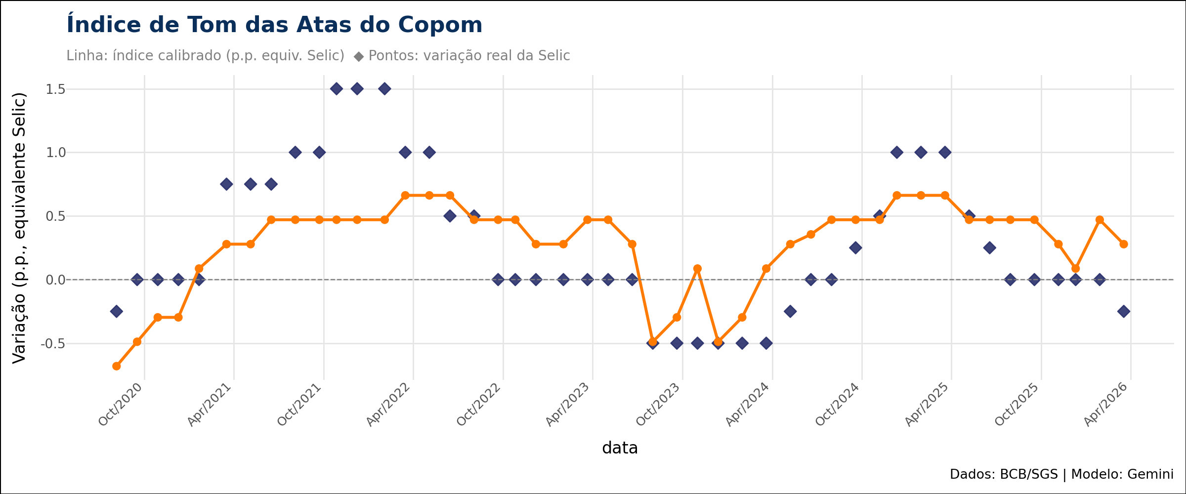 Neste primeiro gráfico temos o índice calibrado (linha vermelha) contra a variação efetiva da Selic em cada reunião (pontos em formato de diamante). A correlação visual é notável. O índice conseguiu capturar com precisão os grandes ciclos de política monetária: