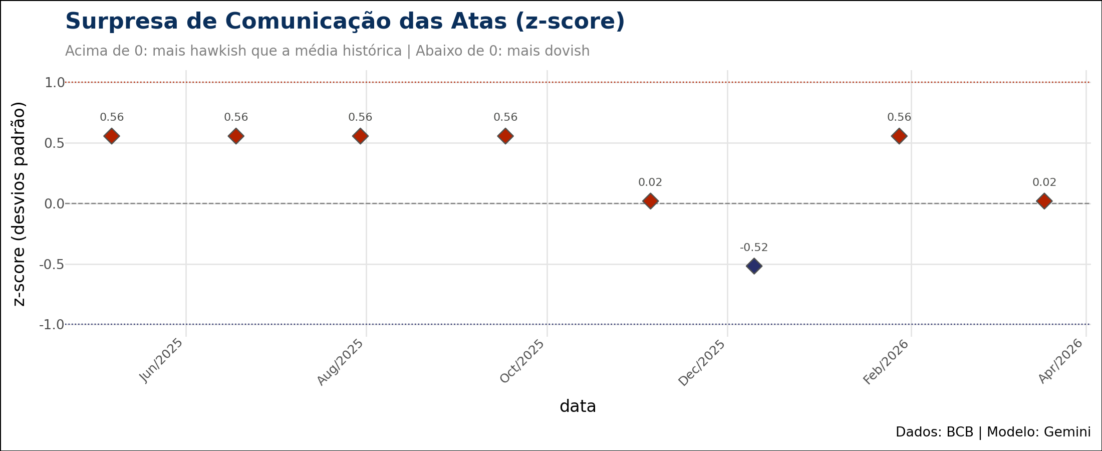 No segundo gráfico temos a "surpresa" do tom de cada ata. Ele calcula o desvio do score de cada reunião em relação à média histórica, expresso em desvios-padrão (z-score). Pontos acima de zero indicam uma comunicação mais hawkish que o esperado, enquanto pontos abaixo de zero indicam um tom mais dovish. Este gráfico é útil para identificar reuniões onde o Copom sinalizou uma mudança de rota inesperada, gerando surpresa no mercado.