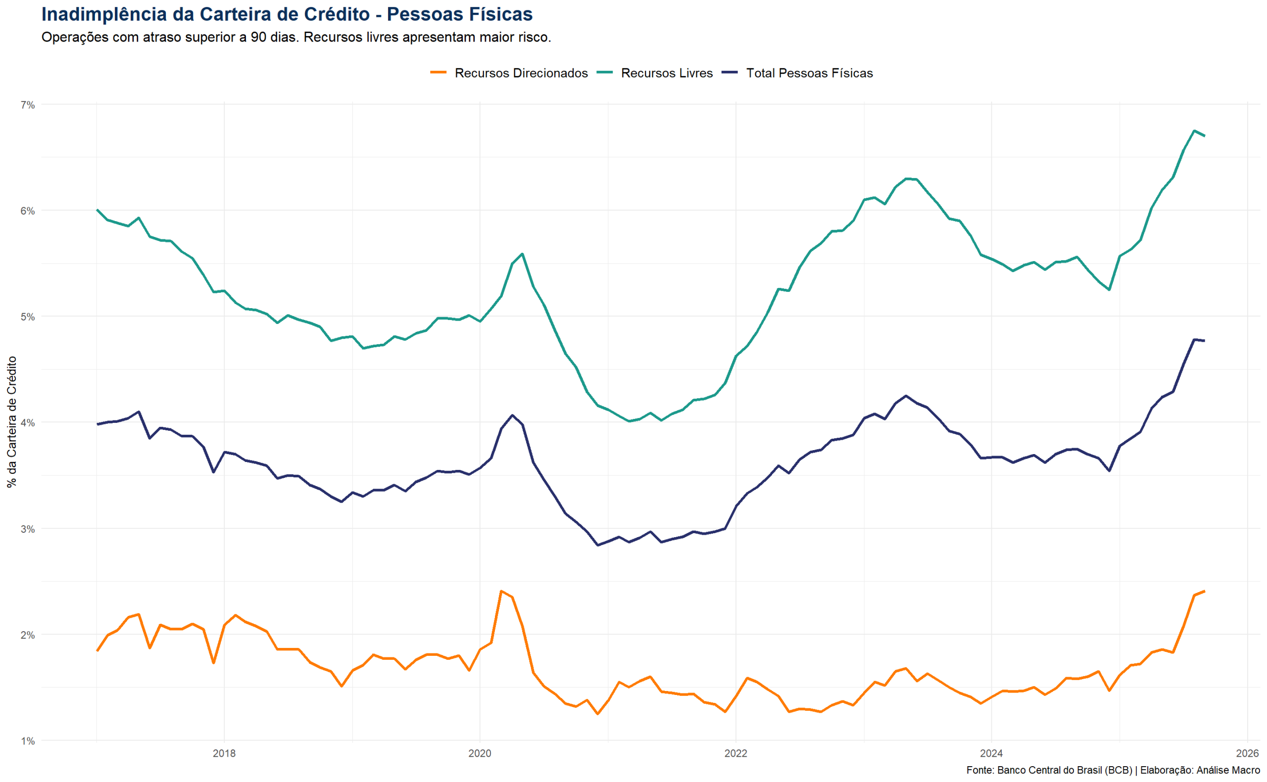 O ciclo recente é claro: uma queda atípica durante a pandemia, fruto dos auxílios governamentais e renegociações, foi seguida por uma forte alta a partir de 2022, reflexo direto do aperto monetário que encareceu o serviço da dívida. A inadimplência total superou os níveis pré-pandêmicos, pressionada quase que exclusivamente pela deterioração na carteira de recursos livres.