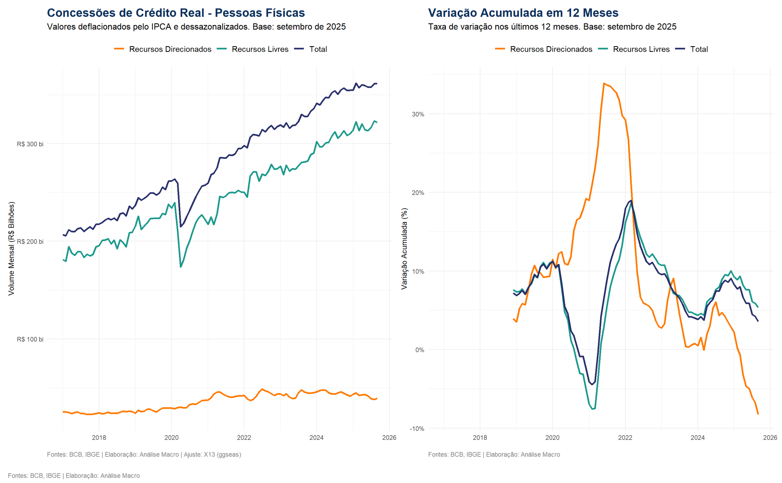 A análise final sintetiza a conjuntura. O painel da esquerda, “Custo do Crédito vs. Risco Realizado”, demonstra a mecânica da política monetária: a alta dos juros ao consumidor precede, com uma defasagem de alguns meses, o aumento da inadimplência. É notável, entretanto, a alta no indicador de inadimplência a partir de janeiro de 2025. Conforme aponta o Relatório de Política Monetária do Banco Central de setembro de 2025, essa elevação foi parcialmente impactada pela “entrada em vigor de novos conceitos e critérios contábeis” (norma IFRS 9), que alteraram a forma como as perdas são provisionadas e fizeram com que operações inadimplentes permanecessem por mais tempo no balanço dos bancos antes da baixa para prejuízo.