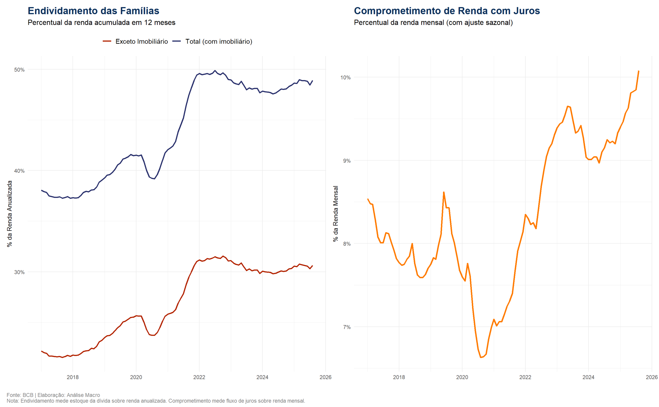 Os gráficos de endividamento e comprometimento de renda contam a história de um duplo desafio para as famílias. Por um lado, o endividamento total (o estoque da dívida) atingiu um pico histórico, superando 50% da renda anualizada, impulsionado em grande parte pelo crescimento do crédito imobiliário.
