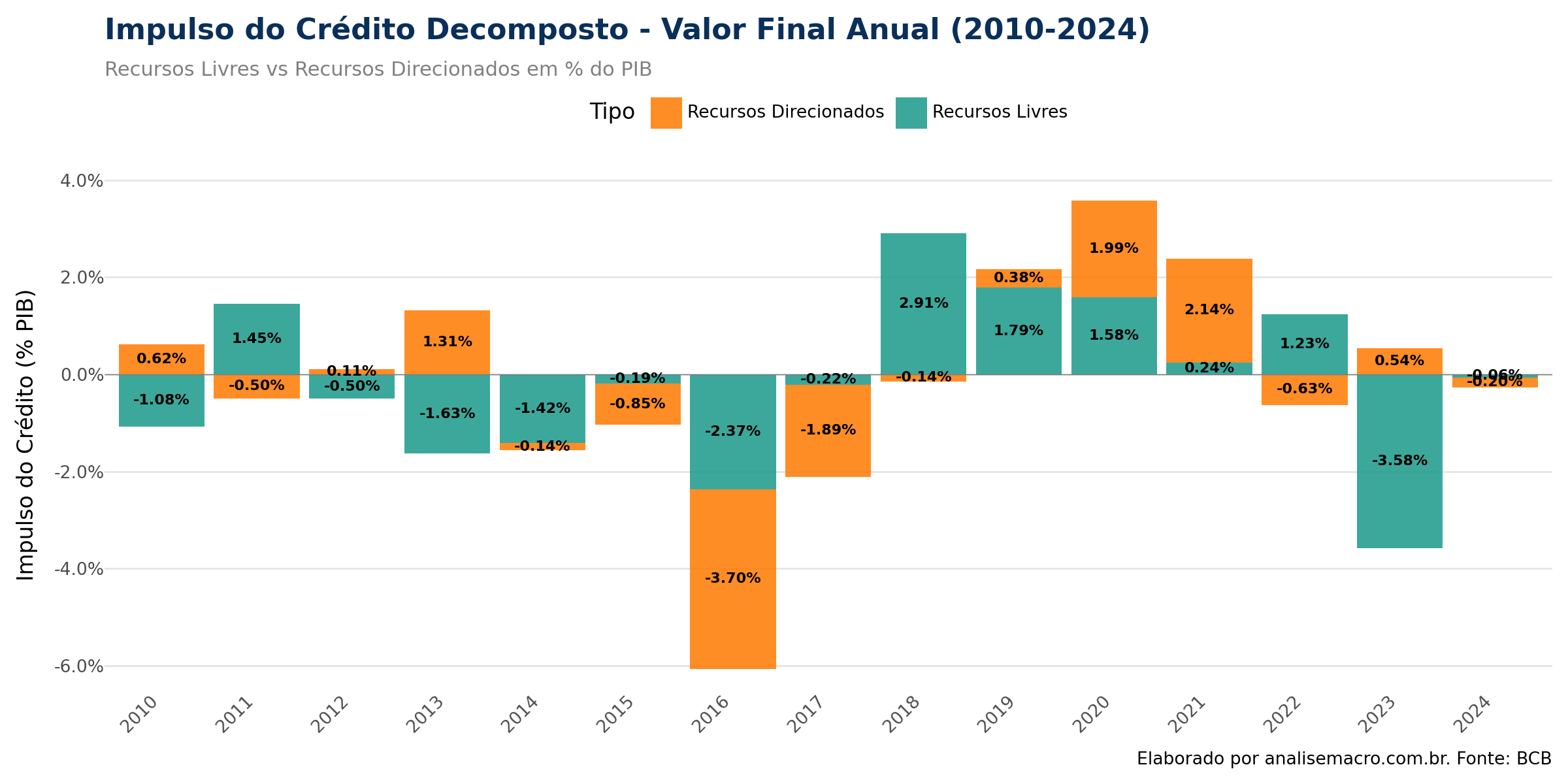 A segregação do impulso entre Recursos Livres e Direcionados revela a heterogeneidade nos canais de transmissão. Enquanto a crise de 2015-2016 foi sistêmica, caracterizada pela retração simultânea da oferta de mercado (aversão a risco) e dos bancos públicos (ajuste fiscal), o ciclo recente apresenta uma divergência notável. A partir de 2021, o segmento de Recursos Livres respondeu com alta sensibilidade ao ciclo de alta da Selic, mergulhando em terreno contracionista conforme o custo de capital se elevava.
