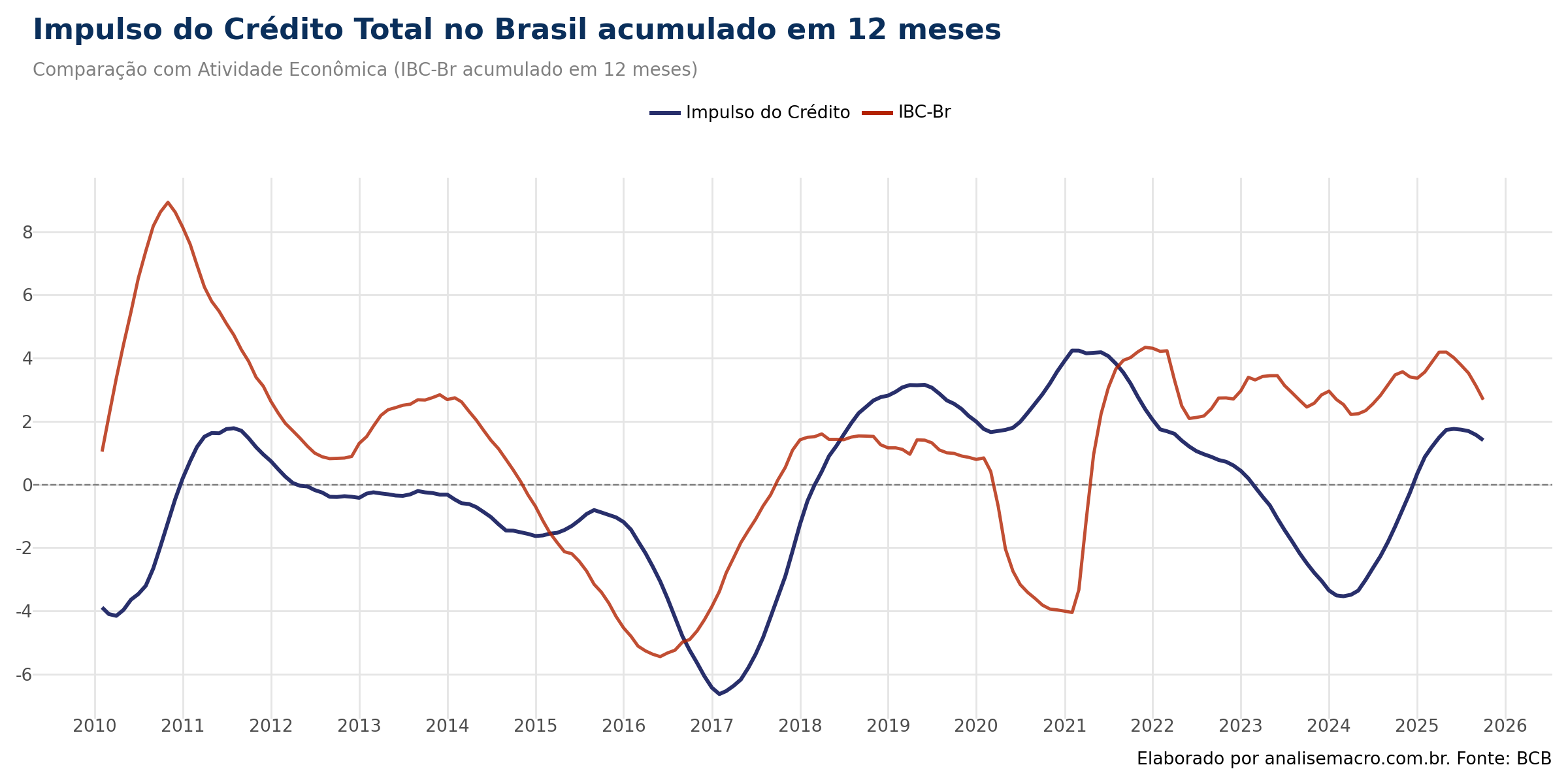 A fórmula aplicada define o Impulso de Crédito como a variação do fluxo de crédito em relação ao PIB. Matematicamente, subtrai-se o fluxo de crédito do período anterior (ajustado pelo PIB) do fluxo atual. Para suavizar a volatilidade inerente aos dados mensais, utiliza-se uma janela móvel de 12 meses (acumulado anual).