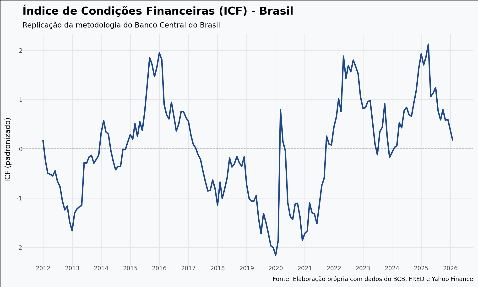 Gráfico de linha azul sobre fundo branco exibindo a evolução histórica do Índice de Condições Financeiras (ICF) no Brasil de 2012 a 2026. O eixo vertical representa o índice padronizado (z-score) e o eixo horizontal o tempo. A curva oscila em torno da linha zero, indicando ciclos de condições financeiras restritivas (valores positivos) e estimulativas (valores negativos) ao longo das últimas duas décadas.