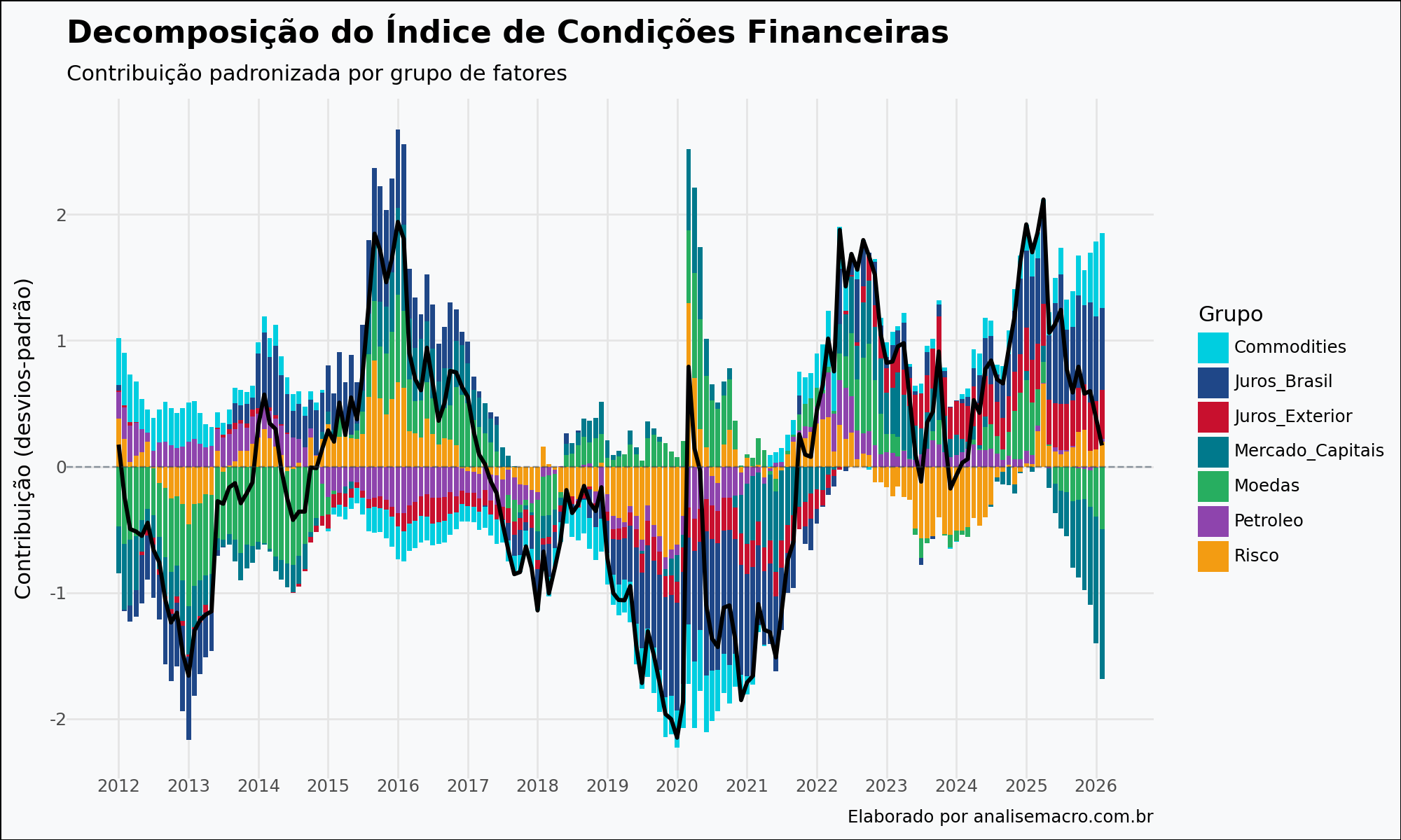A grande vantagem da construção via PCA é a possibilidade de decompor o índice e identificar a contribuição exata de cada grupo de ativos. Ao analisarmos o gráfico de decomposição (Gráfico 1), observamos a evolução dos fatores que pressionam a economia: